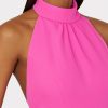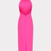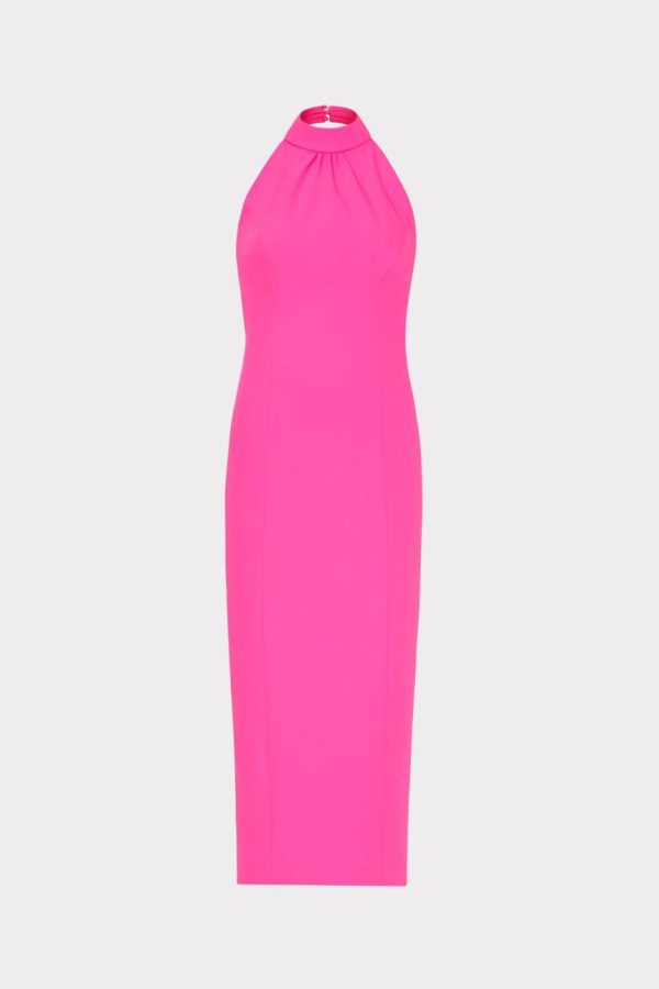 Ready for cocktail hour, our Noor dress has a halter neckline, an open back, and a slightly stretchy curve- hugging silhouette that hits at tea length above the ankles. It’s easy, minimalist style is a fun contrast with its shocking pink hue.